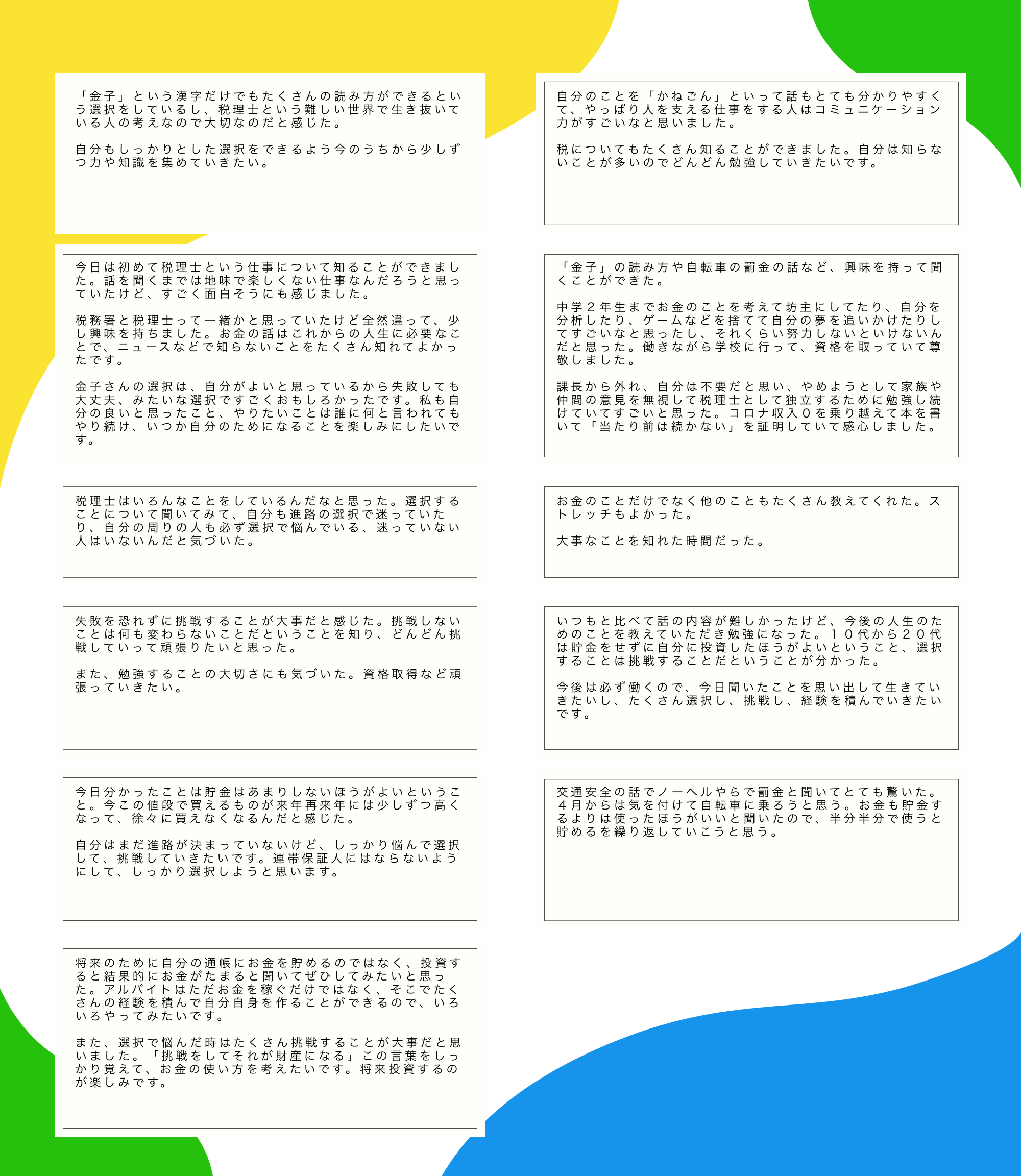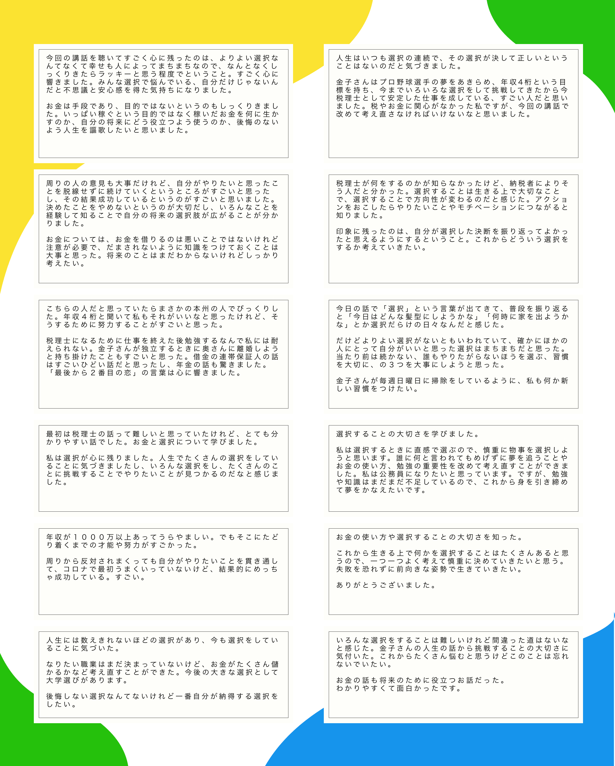 当日お話しした「選択」や「お金と人生」というテーマについて、それぞれが自分なりに考え、向き合ってくれていたことを、感想文から強く感じ取ることができました。